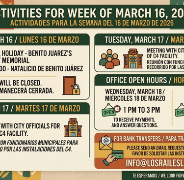 Mantener parques comunitarios, cámaras de seguridad, reparar y mantener la infraestructura comunitaria y coordinar con el gobierno municipal en seguridad, ecología, carreteras y asuntos relacionados con nuestra comunidad. Nuestra oficina está abierta los lunes, miércoles y viernes de 12:00 a 16:00 h. Cerramos los días festivos nacionales. Únase a nuestro grupo de WhatsApp para recibir anuncios, informes financieros mensuales y asuntos urgentes.