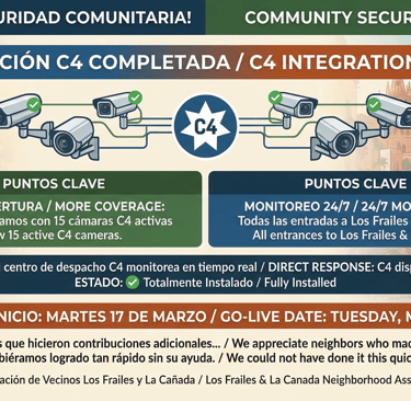Great news! We now have 15 new security cameras connected to the Police Monitoring System C4. These cameras cover uninhabited areas within our community, the main entrance, and a street. As funds become available the association will purchase more cameras to be placed in more areas.